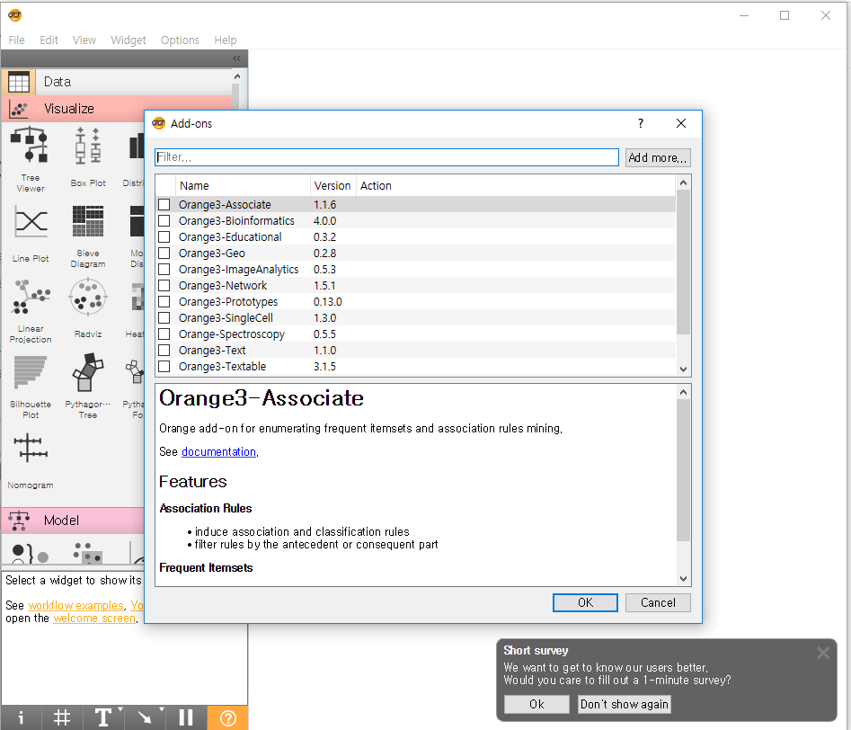 Orange3 프로그램을 설치 후 Options > Add-ons.. 를 클릭했을 때 아래와 같이 tuple index out of range 에러가 날 떄가 있습니다. 이럴 경우 "관리자 권한"으로 실행해주시면 됩니다. 아마도 애드온용 디렉토리나 파일에 접근할 때 권한 부족으로 일어나는 문제로 추측됩니다. (매 실행마다 해주셔야 합니다.)